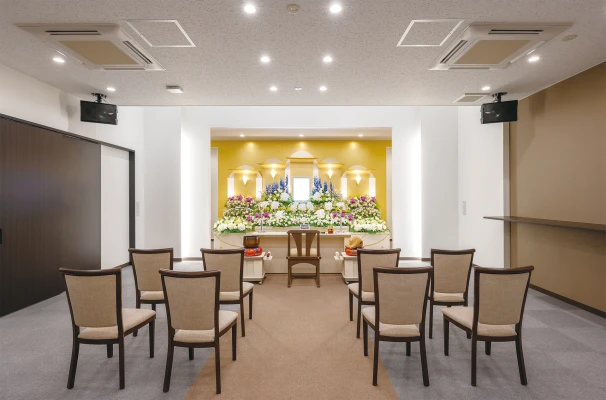 とわノイエ 峰は、モダンな外観と洗練された内装が魅力の家族葬専用の斎場・葬儀場です。最大50名まで対応可能なセレモニーホールと、6名までのお別れに適した小式場(2室)を備えております。プライバシーに配慮した空間のため、周囲を気にせず、ゆっくりとお別れの時間をお過ごしいただけます。また、全宗教・宗派、無宗教、自由葬、音楽葬など、あらゆる葬儀スタイルに対応いたします。