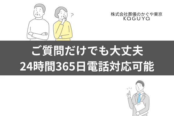葬儀のかぐや東京 (千代田営業所)に葬儀のご依頼をしたい方は、050-5231-1473までお電話ください。24時間365日、夜間や休日問わずいつでも繋がります。