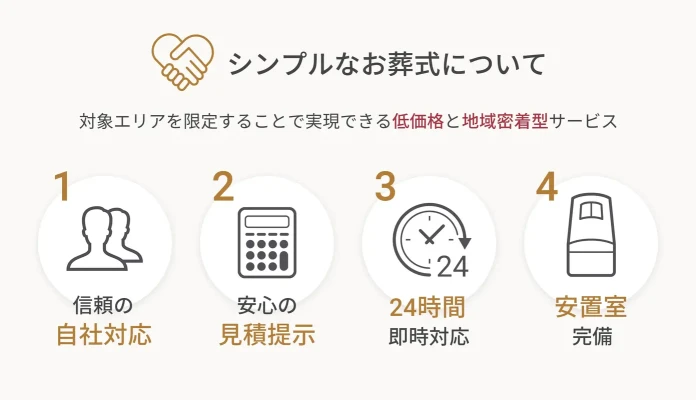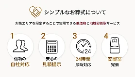 「シンプルなお葬式」では、必要な項目が含まれた安心の明朗会計で、費用を抑えた葬儀を実現します。火葬式やお別れ式など、シンプルなプランを多数ご用意しており、無宗教や少人数での葬儀にも対応可能です。ご家族のご負担を軽減し、心穏やかに故人様をお見送りいただけます。