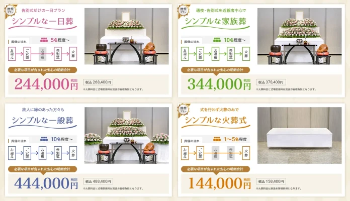 料金 | 直葬・火葬式 :¥158,400〜(税込) 一日葬 :¥268,400〜(税込) 家族葬 :¥378,400〜(税込) 一般葬 :¥488,400〜(税込) 直葬・火葬式 :¥217,800〜(税込) 一日葬 :¥327,800〜(税込) |