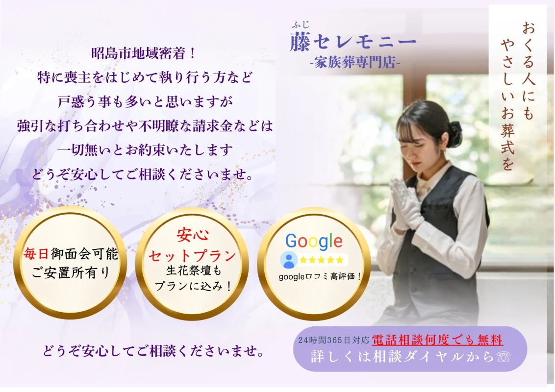 福生市のセレサポートでは、公営斎場を利用した葬儀をご提案し、24時間対応でご遺体をお預かりします。心温まるお見送りを大切にし、事前相談も承っております。