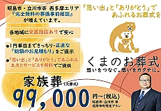 「くまのお葬式」は、「思い出」と「ありがとう」であふれるお葬式を皆様に感じていただけるよう、少し面倒と思われることもあるかもしれないぐらいお客様のお話を聞かせてもらいお客様と一緒に「想い」を「カタチ」にするお手伝いをさせていただきます。 そして、正直すぎるお見積りと料金でお葬式をご提供いたします。昭島市に根差し、24時間365日、葬祭ディレクターの資格を持つスタッフが、悲しみの中にある皆様を温かくサポート。最後だからこそ、想いのこもった心に残るお別れの時間を。感謝の気持ちを大切に、最後の旅立ちをお手伝いします。