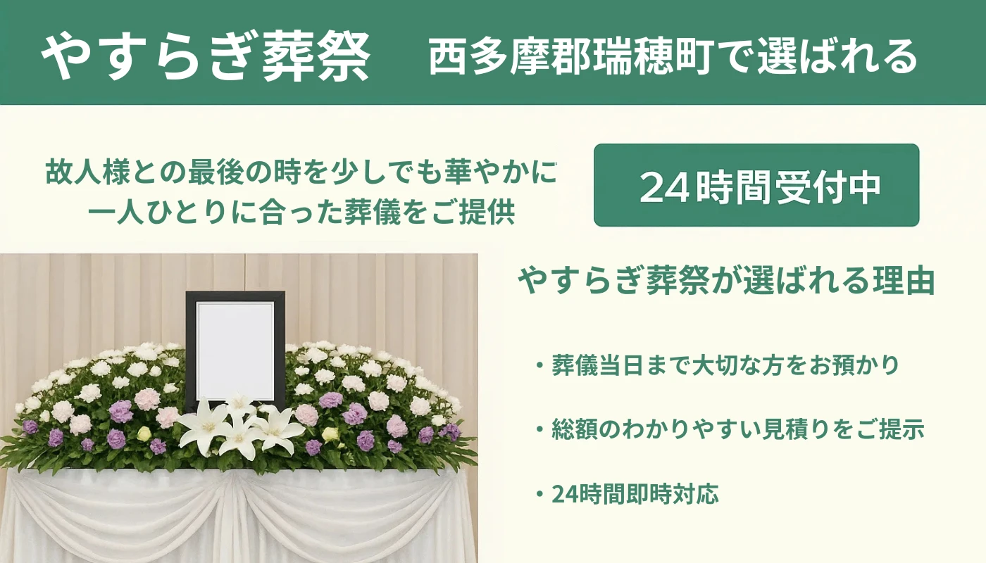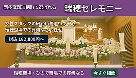 瑞穂セレモニーは、西多摩郡瑞穂町にある葬儀社です。ワンストップ対応が魅力で、お任せいただければ手続きから安置、葬儀まで全てをお手伝い。女性スタッフならではの細やかな気遣いで、徹底サポートいたします。「葬儀のこと考えなきゃ。でも何をしたらいいのか分からない……」そんな時はまず、瑞穂セレモニーにお問合せください。