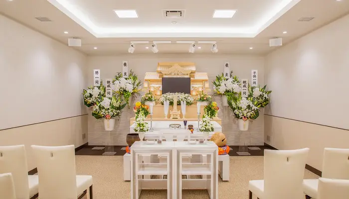 「サン・ライフ(ファミリーホール日野本町)」は一日一家族限定でご利用いただけます。こじんまりとした式場は家族葬にピッタリ。他の喪家と重なることなく、ご家族様とご縁の深かった方々で静かにゆっくりとお別れの時間を過ごすことができます。