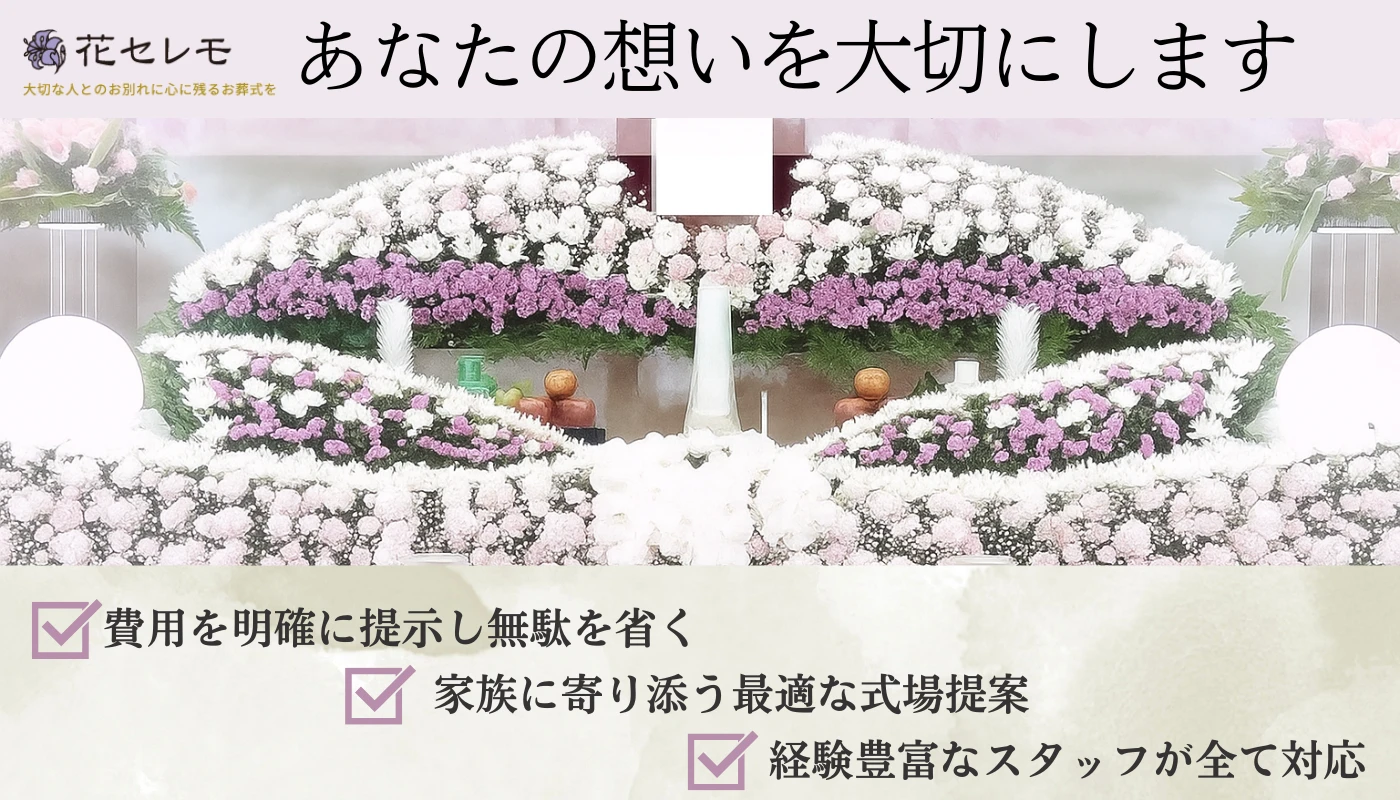 大切な家族とのお別れの時間を【ゆったり過ごす】ことができるのが花セレモのお葬式。 業界経験30年以上のスタッフが、家族の想いを聞きながらゆっくりと時間をかけて葬儀の準備をします。 「葬儀の準備が慌ただしくて、まともにお別れできなかった」なんてこと、花セレモではありえません。