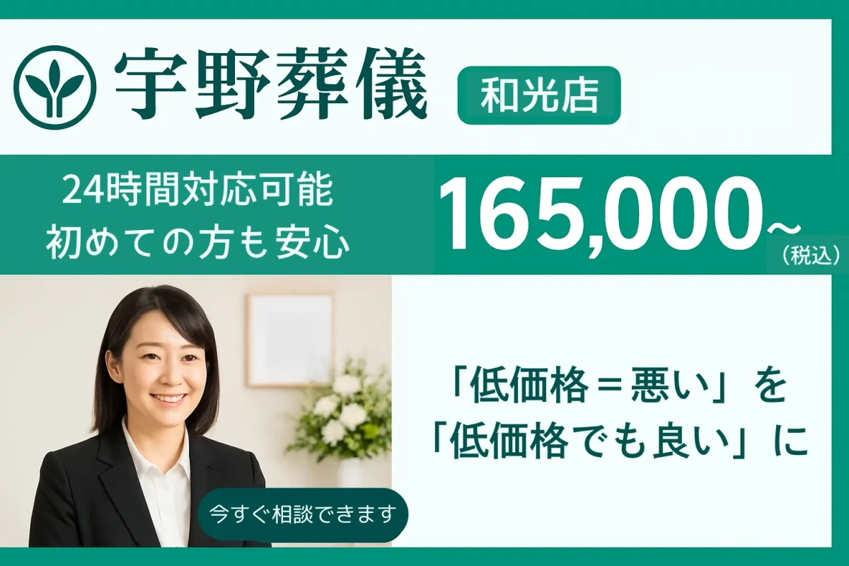 宇野葬儀は、創業50余年の歴史ある葬儀社です。香典返しを地元の名産品から利用するなど、地元との関わり合いを大切にしています。また和光市から和光市民葬取扱店に認定された信頼と実績があります。さらに、50年もの間、低価格で高品質な葬儀を提供し続けた結果、板橋区・朝霞市・新座市・志木市からも市/区民葬取扱店に認定されました。