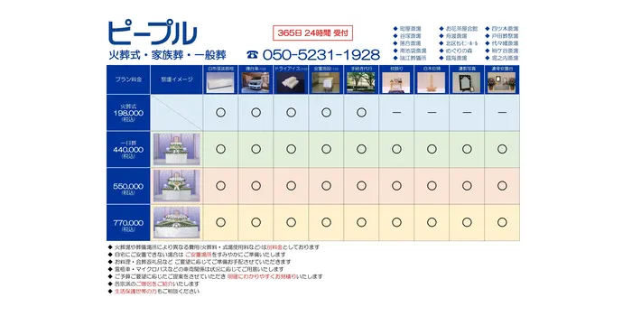 料金 | 直葬・火葬式 :¥198,000〜(税込) 一日葬 :¥440,000〜(税込) 家族葬 :¥550,000〜(税込) 一般葬 :¥770,000〜(税込) |