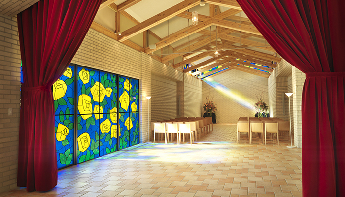 ステンドグラスから差し込む光が祭壇を優しく包み込む、自社式場「ホールロゼリア」。ご家族だけの貸切空間をご提供できます。他にはない式場として、利用された方からは大変喜んでいただけています。 メインホールと待合室(会食室)がワンフロアで繋がっており、家族葬に最適な雰囲気です。 格式のある仏式から自由な無宗教葬、楽器を用いた音楽葬など幅広い形式を執り行えます。祭壇もメインホールの雰囲気に合わせ、いせやオリジナルの生花装飾で彩ります。