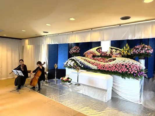 生花祭壇(フラワー祭壇)と生演奏で大切な人をお見送りのお手伝いをさせていただきます