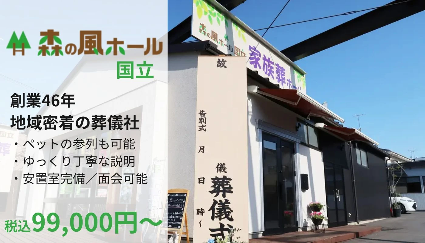 国立市で浄土真宗に対応している葬儀社は、国立市青柳3-18-11にある「多摩中央葬祭(森の風ホール国立)」です。