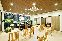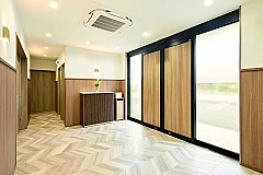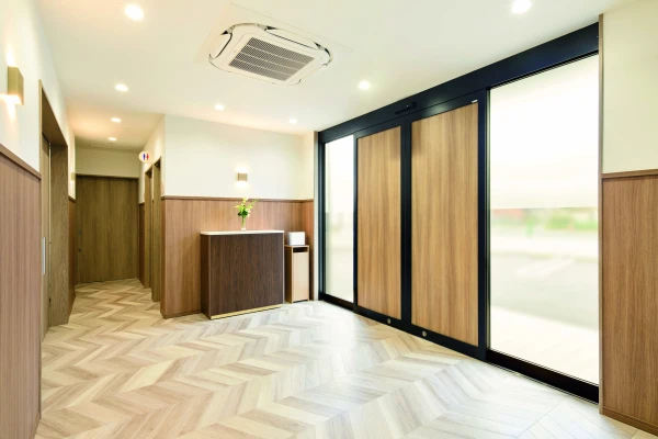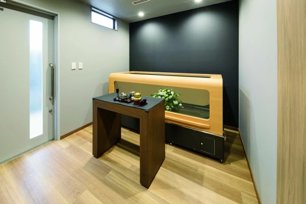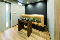 広すぎず狭すぎない家族葬に適した、品質感のある内外装のセレモニーホールです。ご家族や身近なご親族が居心地のよい空間づくりを心がけております。