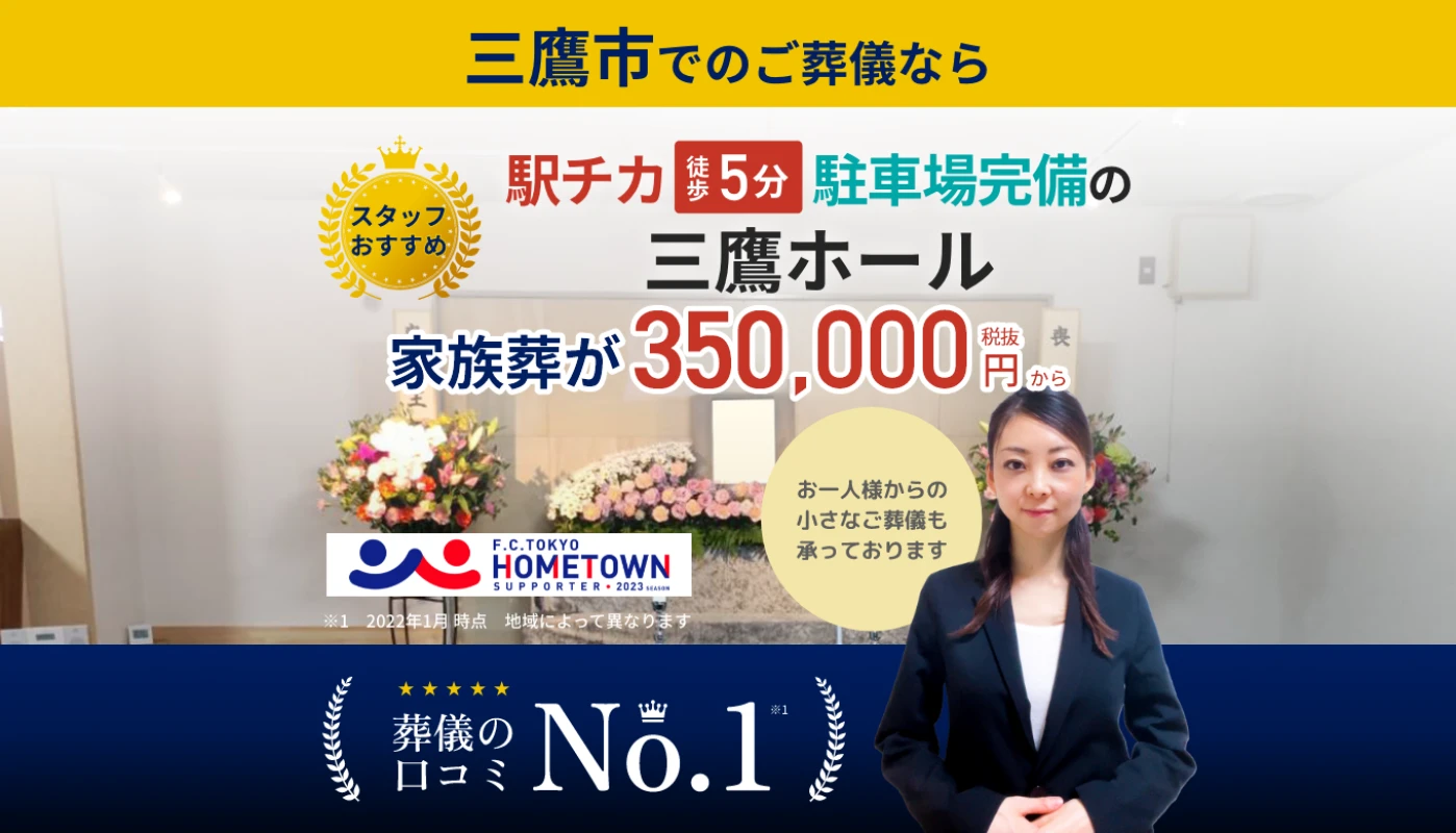 ▶家族葬専用の自社式場「家族葬ホール三鷹」で安心の家族葬を ▶︎全体口コミ件数「200件」突破 ▶︎サービスは手厚く、価格は安く! ▶︎葬儀後の遺言や相続も終活カウンセラーに相談できるから安心