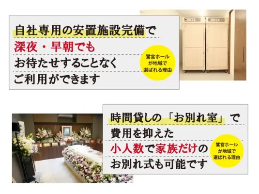 1日1組限定で小規模のお葬式(家族葬・1日葬・火葬式)ができる家族葬ホール「鷺宮ホール」でのお葬式が地元のお客さまを中心に数多く選ばれています。ホールの使い方はお客さまのご希望の葬儀スタイルによってアレンジが可能です。 「費用を抑えた火葬式でも故人さまとお別れの時間を過ごしたい」というお客さまのご希望で誕生した時間貸しのホール利用も人気で、鷺宮ホールだとお客さまの希望が実現できると好評です。また、ご遺体の安置施設が併設されており、付き添い安置 ※利用条件あり も可能です。