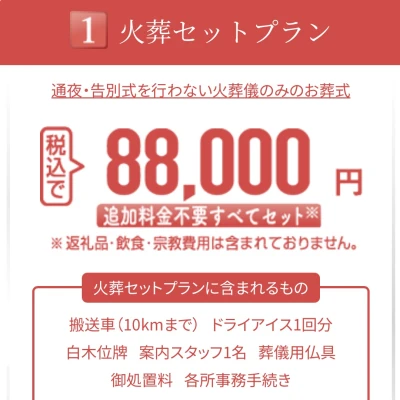 88,000円〜通夜・告別式を行わずに火葬のみでお見送りするプランです。