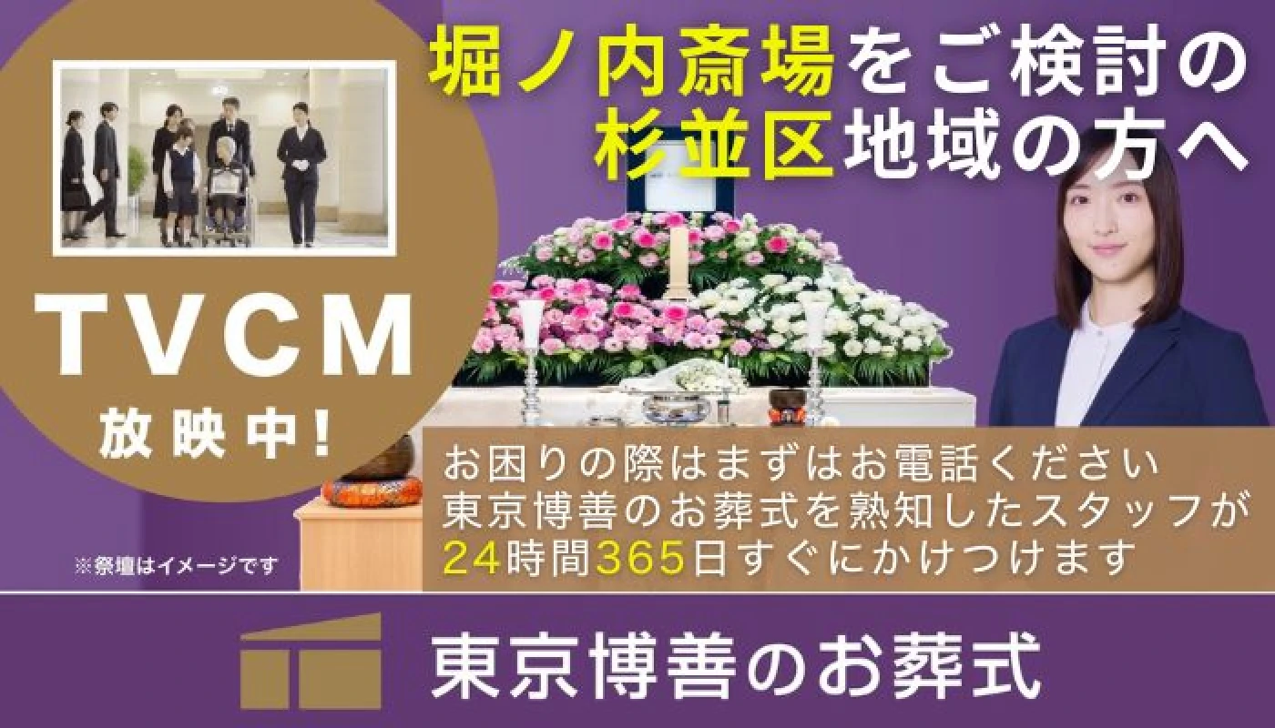 「東京博善のお葬式-堀ノ内斎場-」は古くから杉並区地域を中心にお住まいのたくさんの方々にご利用いただいております。そんな歴史の深い式場で家族葬から社葬までお客様に合ったご葬儀をご提案いたします※「東京博善のお葬式」は東京博善(株)のグループ企業である、(株)広済堂ライフウェルが葬儀施行を執り行うサービスです。