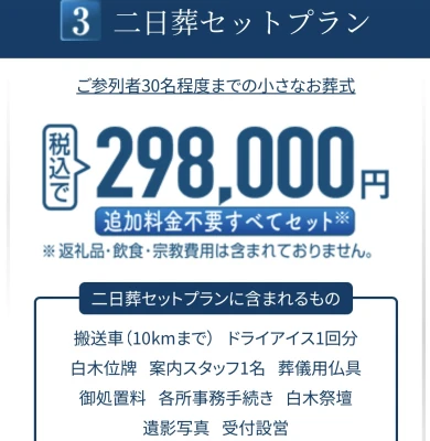 298,000円〜御親族、御親戚、極近い関係の方々のみで、初日に通夜、二日目に葬儀・告別式を行うプランです。