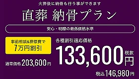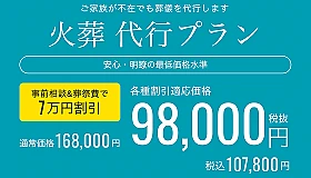 146,980円〜合同供養墓へのご納骨を含むプランとなります。お墓がない、供養先がない方向けのプランとなります。 式典(通夜、告別式)がない葬儀形式になります。式典かかる費用が含まれていない分、費用を最小限に抑えることができます。火葬日やお迎え場所によっては価格が変動する場合がございますので、まずはご相談ください。また葬祭費申請方法や他社様との見積り比較など無料でおこないますので、お気軽にご相談ください。