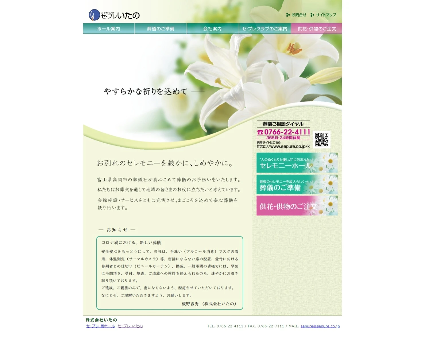 高岡市の葬儀社「いたの」は、真心を込めてお葬式のお手伝いをいたします。コロナ対策を徹底し、安心してご利用いただける環境を整えています。24時間365日対応で、事前相談も承ります。