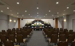 外観はシック、内部は温かみのある葬祭会館です。葬儀から会食、法要まで執り行えます。