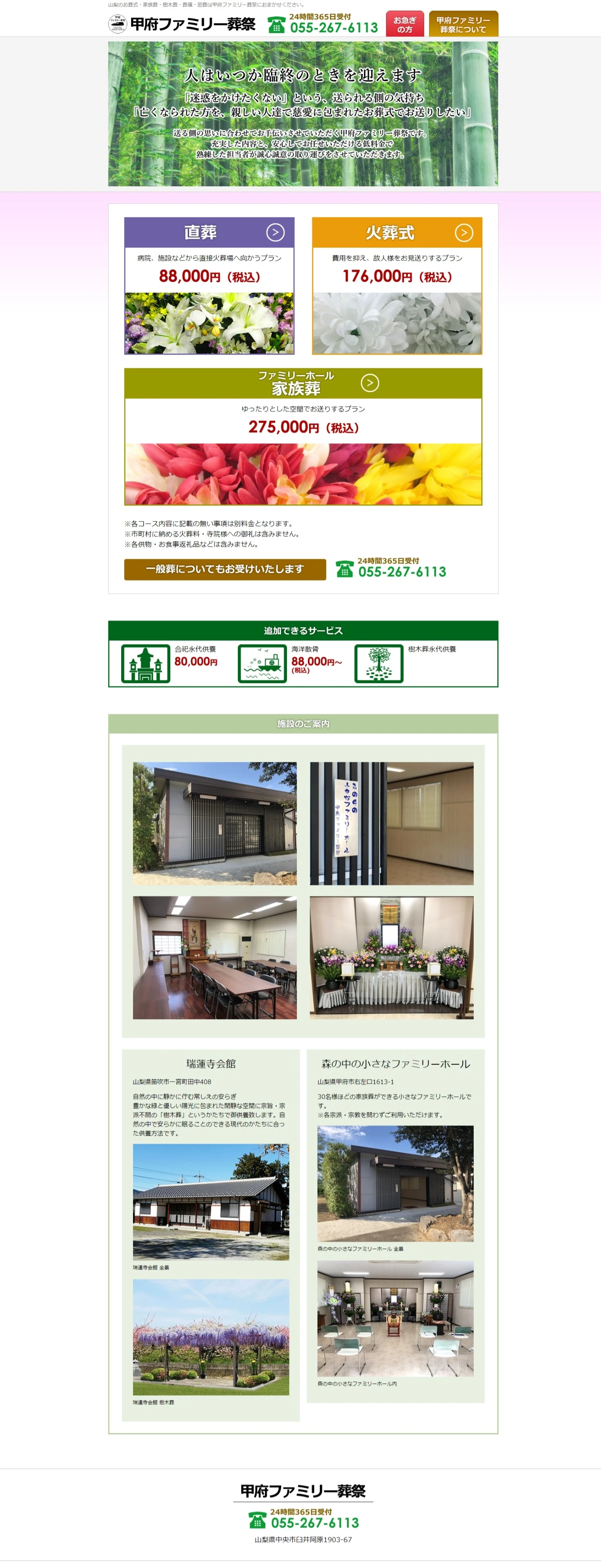 甲府ファミリー葬祭は、各宗教・宗派の「火葬式・一日葬・家族葬・一般葬」などの葬儀に対応できる中央市の葬儀社です。