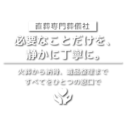 165,000円〜立ち会いが難しいご家族に代わり、搬送から火葬までを当社が丁寧にお預かりするプランです。 安置料無料、火葬後の遺骨お渡しや、合祀墓への納骨にも対応しています。(※納骨代込み) 遠方のご親族様、血縁関係の遠い方、疎遠になっていたご親族様などにおすすめのパックです。 火葬日も弊社に一任いただく形となります。追加の安置費用は無料です。 当日、お立合いをご希望のお客様は別途¥33,000を頂戴いたします。